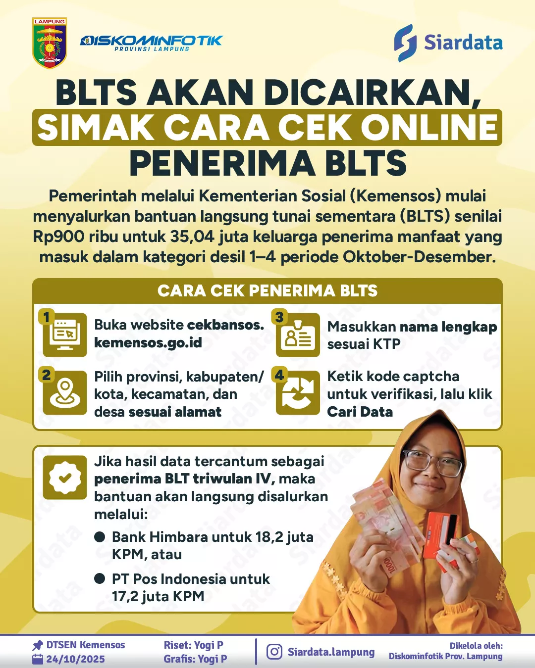 BANDARLAMPUNG, DL – Pemerintah melalui Kementerian Sosial (Kemensos) mulai menyalurkan Bantuan Langsung Tunai Sementara (BLTS) bagi 35,04 juta keluarga penerima manfaat untuk periode Oktober–Desember 2025.